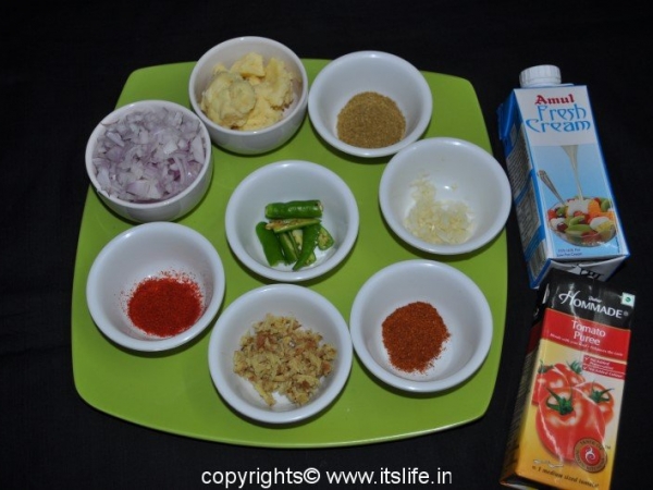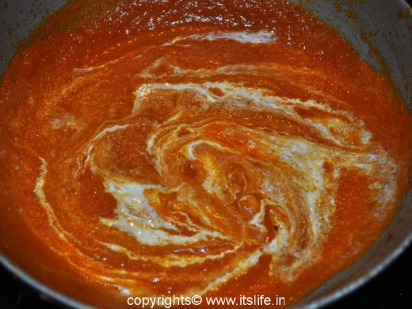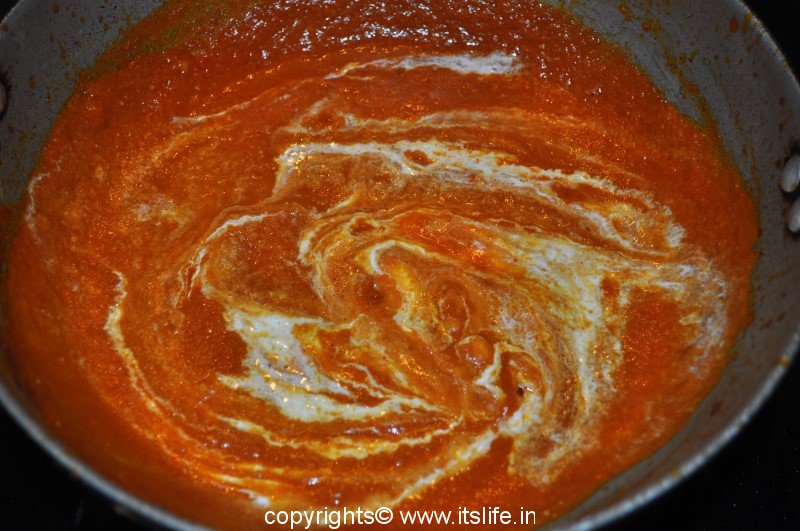 Add the Onion paste and Cream and mix well. Add Garam Masala, Chili Powder, Coriander Powder, and Salt and mix well.