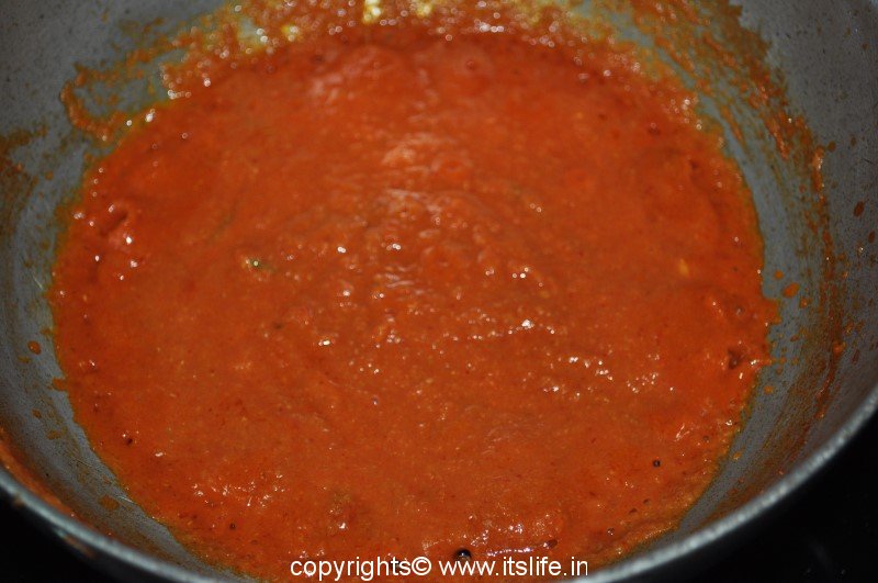 Heat 2 tbsp Oil and add Green Chilies and Tomato Puree and cook until the moisture evaporates.