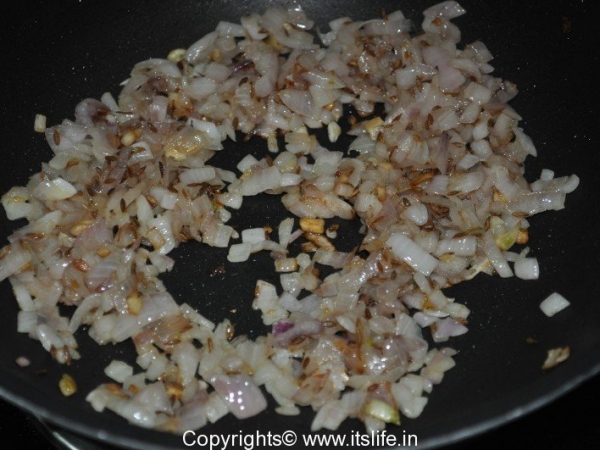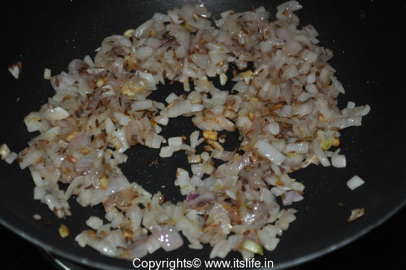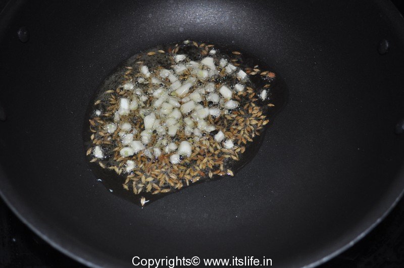 Heat Oil, add Jeera and then Garlic. Saute for a minute.