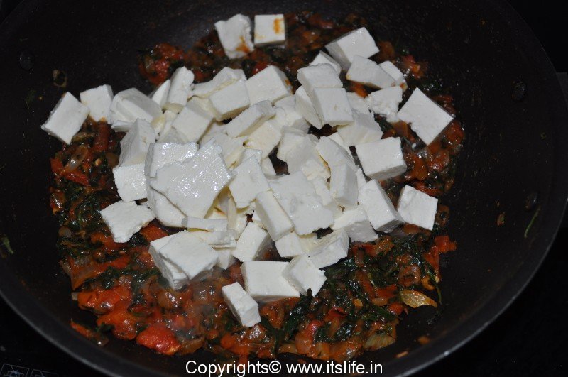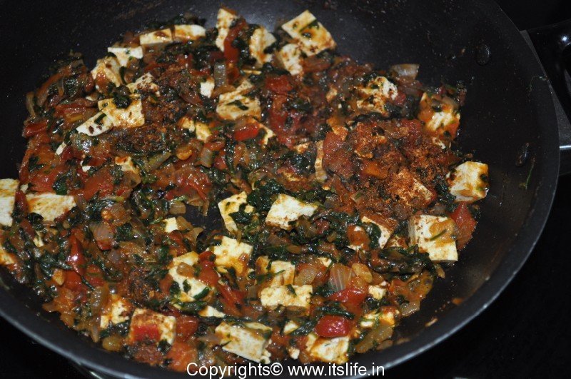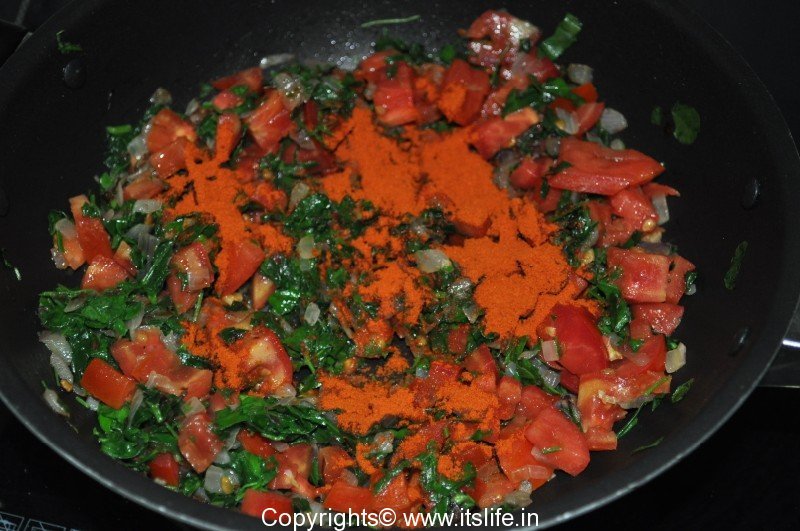 Add Tomatoes, Chili and Jeera Powder and again cook for two to three minutes.