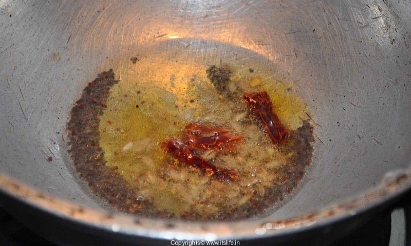 Wash and chop Radish leaves. Heat Oil, add Mustard Seeds and when they splutter add Jeera, Red Chilies, Hing and Turmeric Powder.