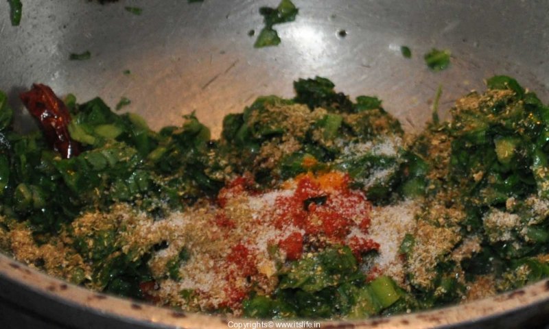 Add Radish leaves and sauté for 3 mts. Add Chili Powder and stir. Add Salt and Besan and stir for 2 minutes.