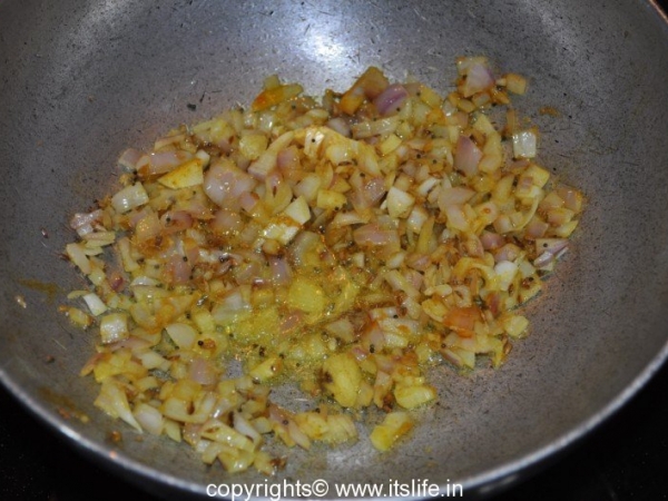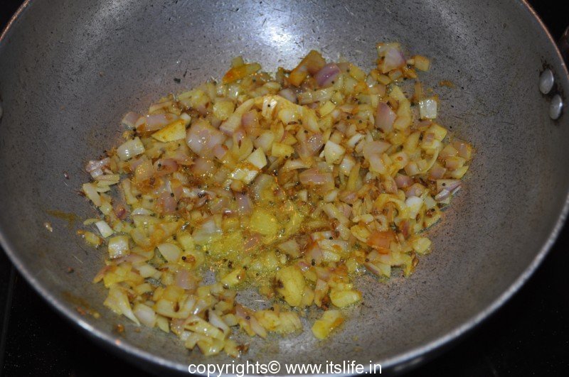 Grind the ingredients to a paste and keep it aside. Heat Oil, add Mustard Seeds, Jeera and when they splutter, add Turmeric Powder. Add Onion and saute for a minute or two.
