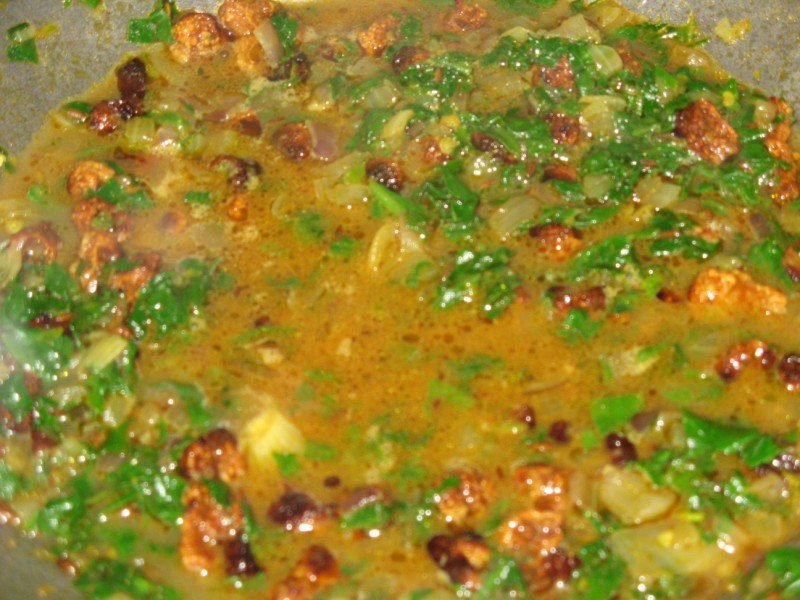 Heat 1tbsp Oil in a kadai and add Jeera and when it splutters add Turmeric powder, Onion and sauté for a minute. Next, add Tomatoes and Green Chili and fry for a minute. Add Palak, Salt, Red Chili Powder and Mangodi. Stir. Add ½ to 1 Cup water and cook for 2 to 3 minutes.