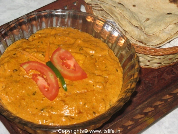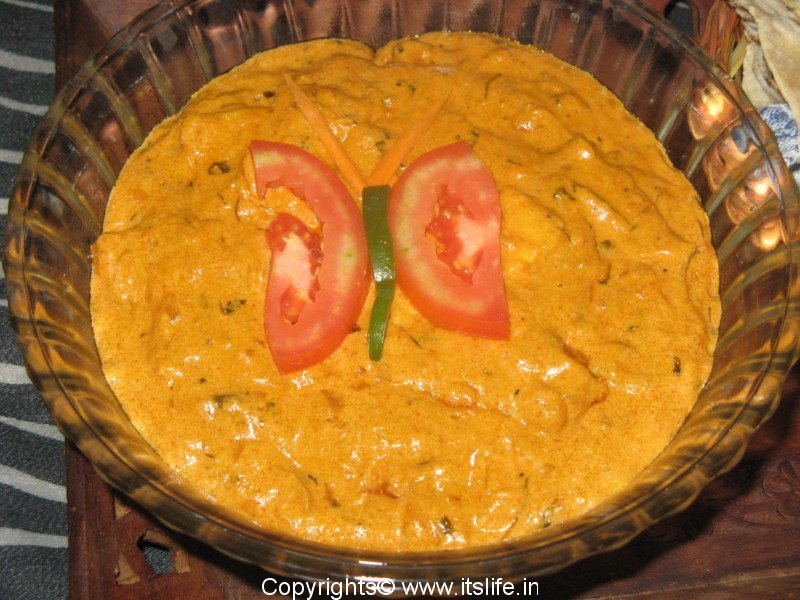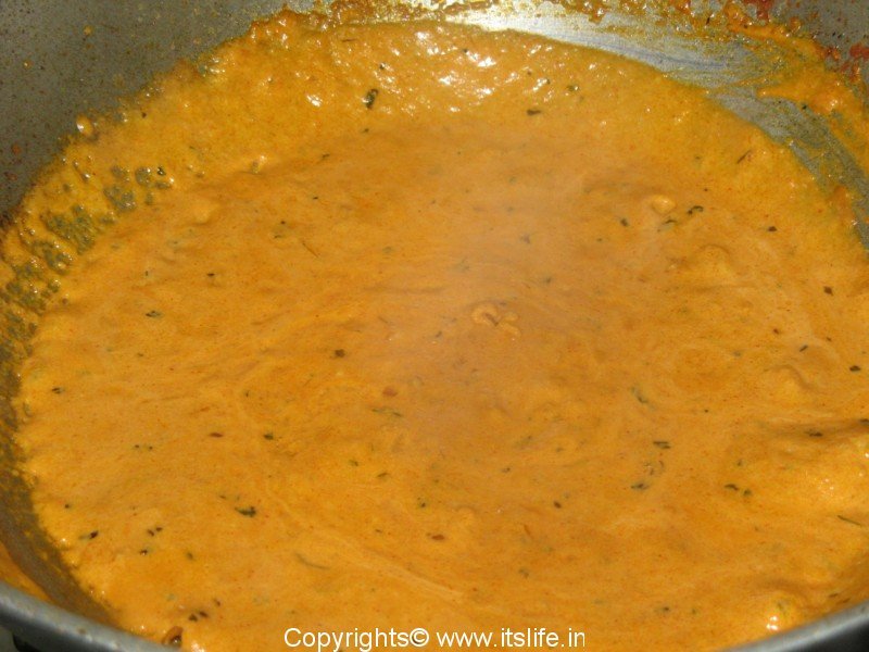 Heat Butter in a thick-bottomed pan. Add Ginger – Garlic paste and sauté for a minute. Add Onion paste and sauté until the raw smell diminishes. Add Turmeric Powder and Tomato Puree and sauté again for two minutes. Add Chili Powder, Coriander Powder, Cashew nuts paste, Fresh Cream and keep stirring.
