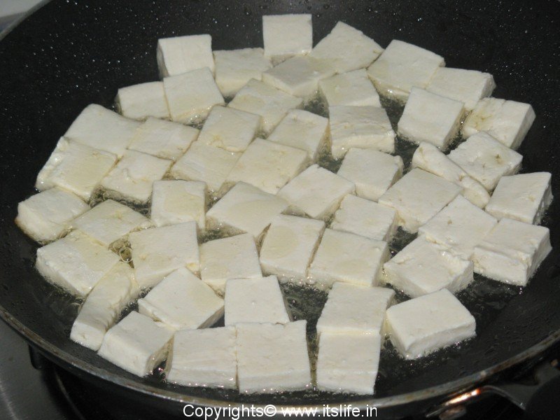 Heat Oil in a flat pan and add the paneer and shallow fry them until they turn pink. Remove and keep aside.