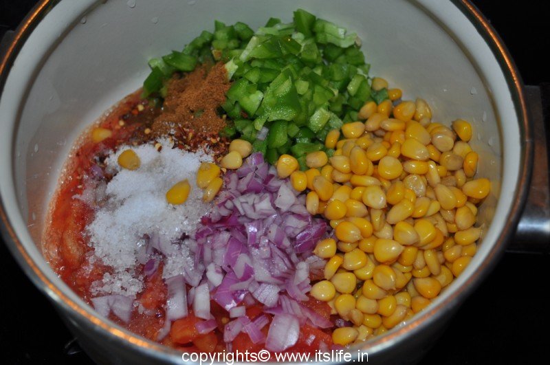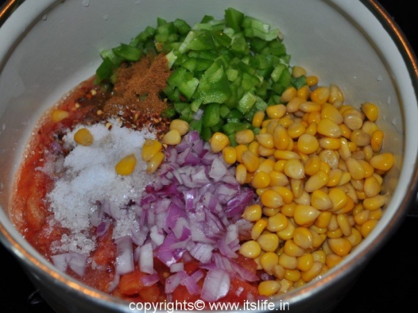 To the mixing bowl, add Capsicum, Onion, and Corn. Add the rest of the ingredients.