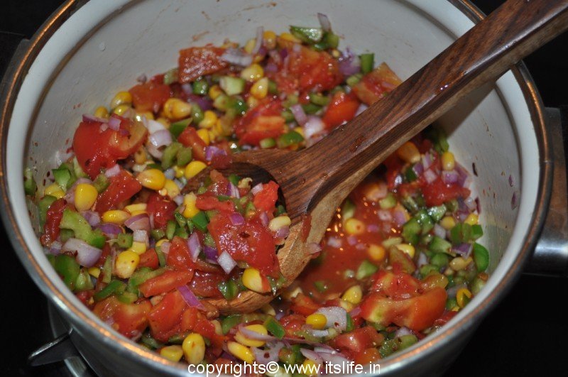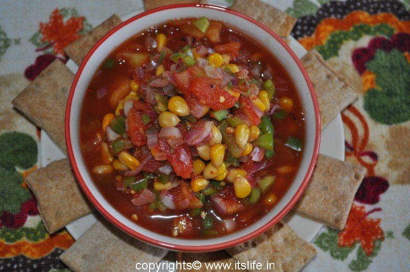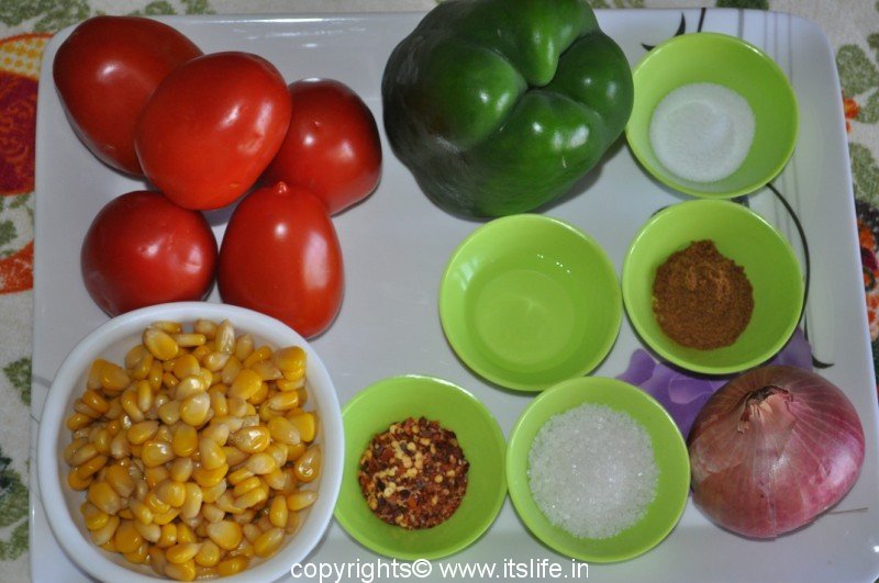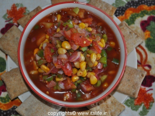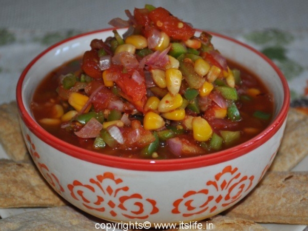 Pepper, Tomato, Corn Relish is an accompaniment, which can be served with Crackers, Bread, Indian Bread, or eaten just like that!