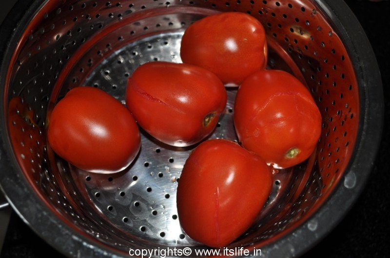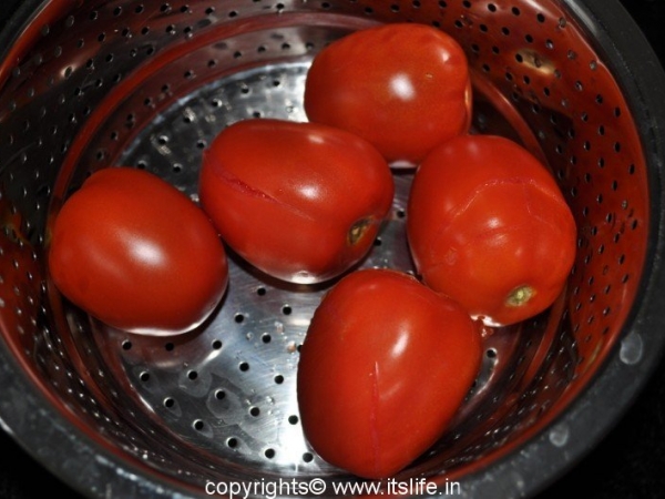 Blanch Tomatoes and peel. Chop into small pieces and remove to a vessel.