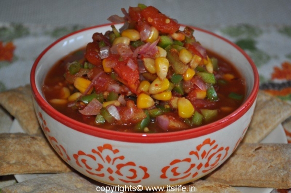 Pepper, Tomato, Corn Relish is an accompaniment, which can be served with Crackers, Bread, Indian Bread, or eaten just like that!
