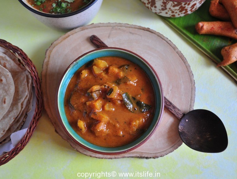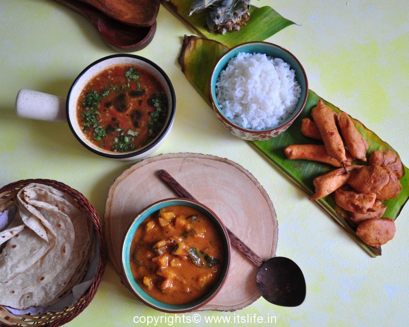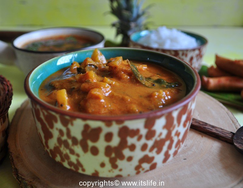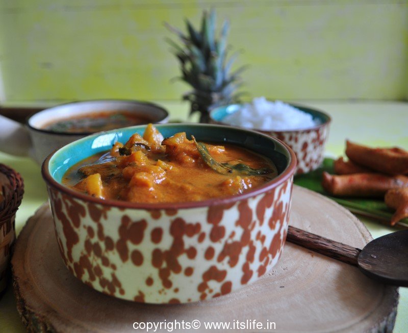Serve hot Pineapple Gojju with Phulka, Huggi(Pongal).