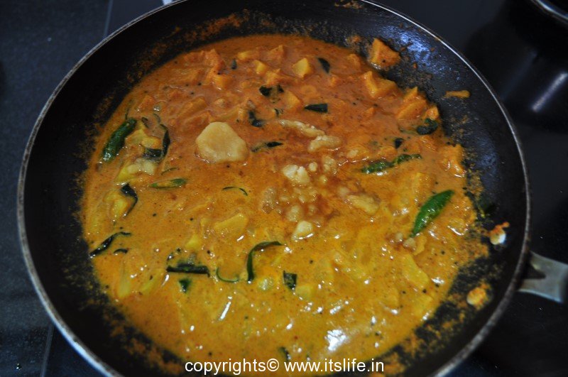Cook Pineapple pieces with water and little salt and sieve. Keep cooked Pineapple aside. Grind Coconut and Gojjina pudi to a paste.