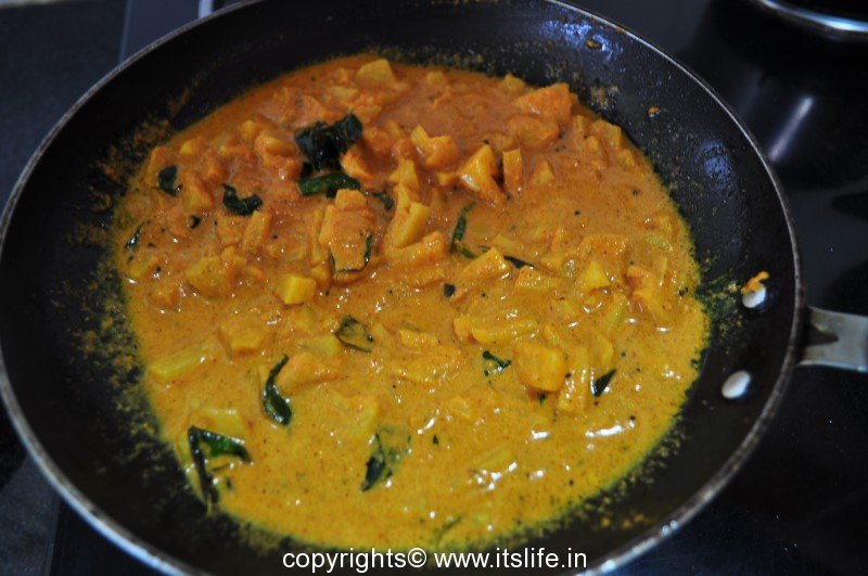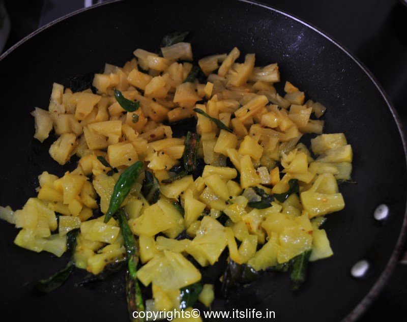 Add water if needed. Heat Oil in a kadai/pan and add Mustard Seeds and when they start to splutter, add Turmeric powder, Green Chilies, and Curry leaves. Next add the cooked Pineapple pieces and stir-fry.