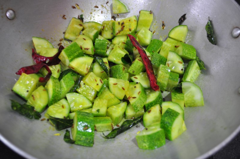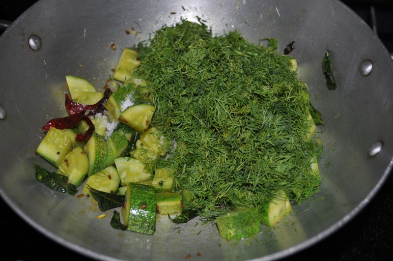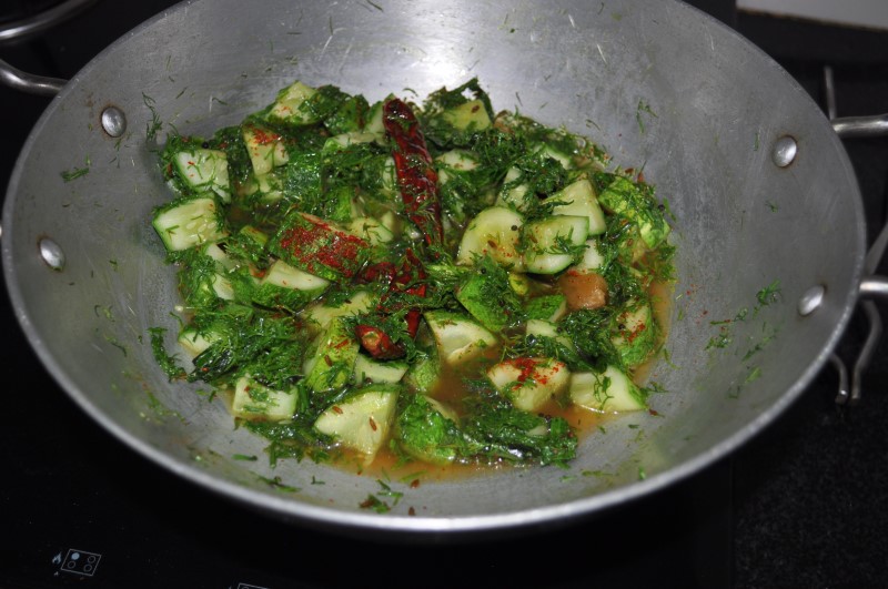 Dice Cucumber along with the skin. Clean, wash and chop Dill. Heat Oil, add Mustard Seeds when they splutter add Red Chilies, Turmeric Powder, and Cucumber. Stir for a minute.