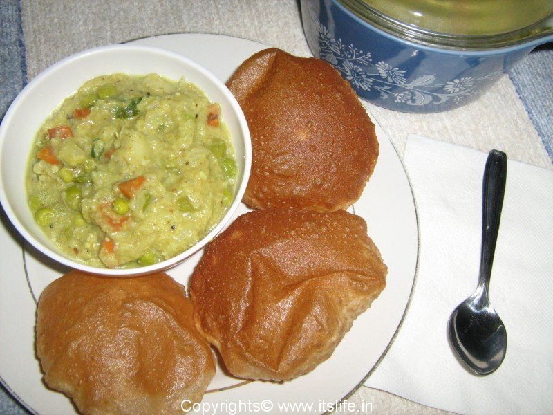 Serve hot Sagu with Poori, Phulka, Chapathi or Mysore Set Dosa.
