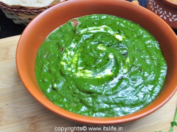 Serve hot Sarson Ka Saag with Makki Ki Roti or Phulka, Onions and Green Chilies.
