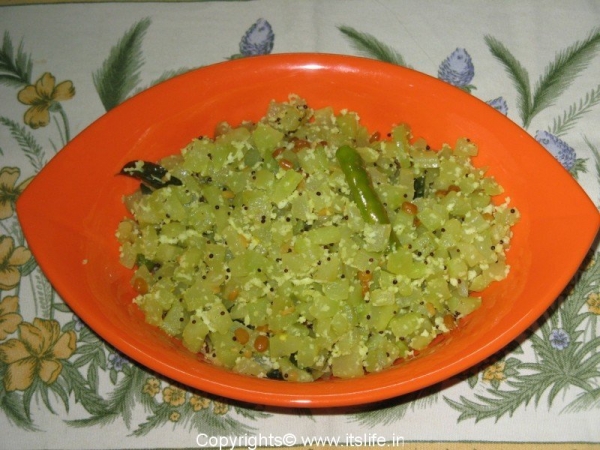 Peel and chop Seemebadanekayi into small pieces. Heat Oil in a pan, add Bengal Gram, Urad Dal and when they turn pink, add Mustard Seeds and when they splutter add Turmeric Powder, Curry leaves, Green Chilies and stir. Add the vegetable, Salt and a cup of water and close the vessel and cook until the water evaporates. Add Coconut and mix. Serve with Rice and Saaru / Rasam or Chapathi / Phulka.