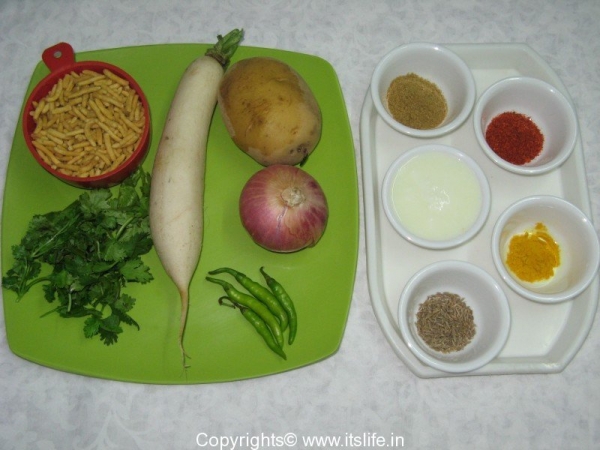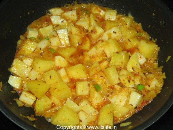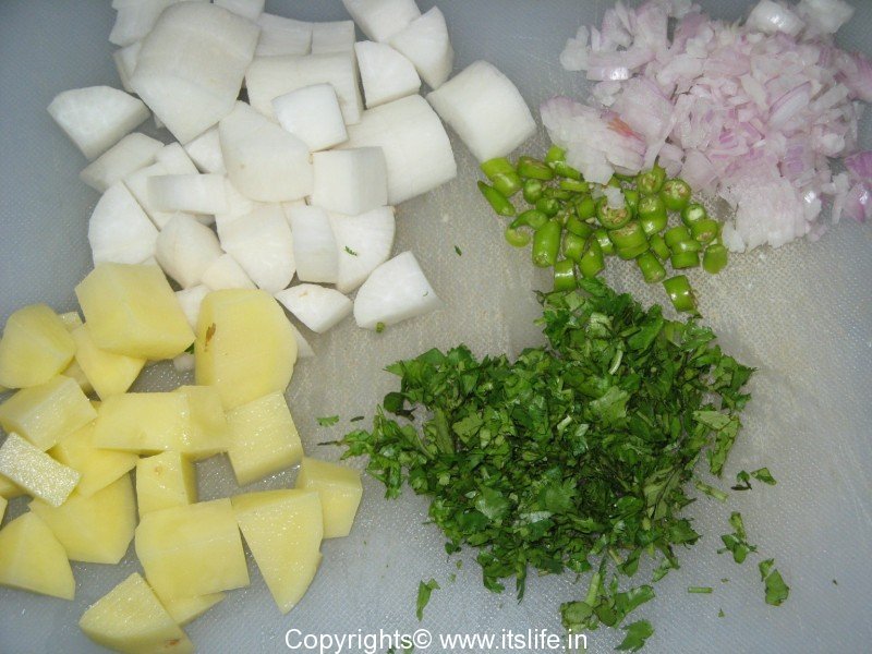 Add Radish, Potatoes, and Green Chilies and mix well.