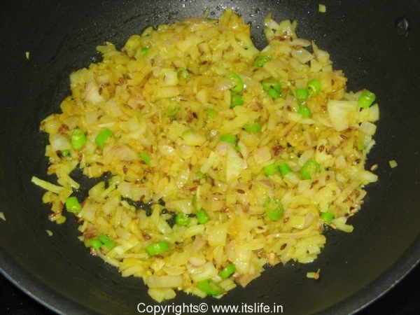 Heat Oil in a pan, add Turmeric Powder and Onion and sauté for two minutes.
