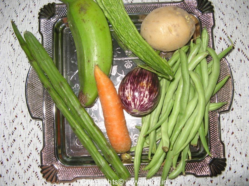 Peel Potato, Carrot and Raw Banana and chop into pieces. Chop Drum Stick, Brinjal and Bitter Gourd.