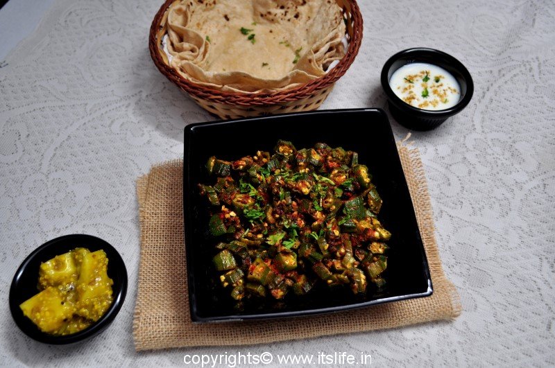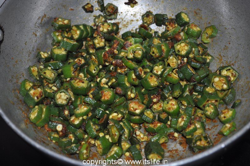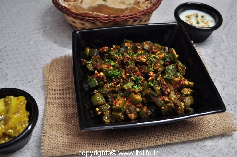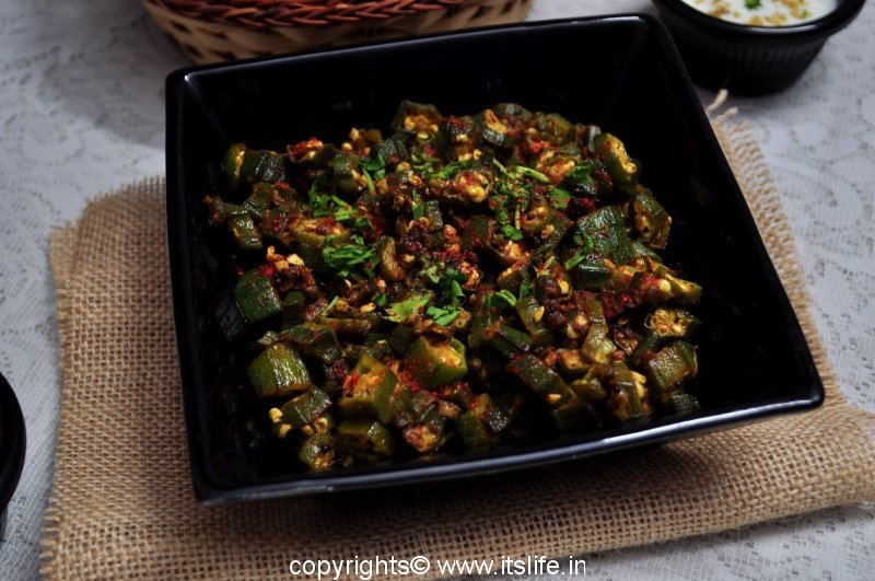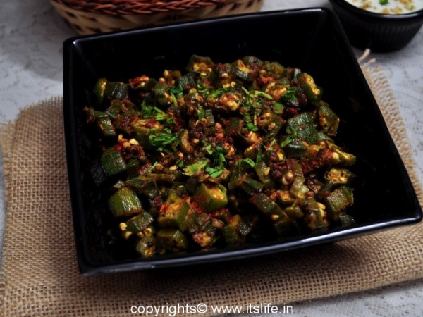 Sookha Bhindi is a dry side dish prepared using Ladies finger/Okra/Bhendekayi.