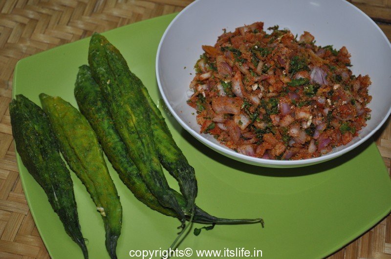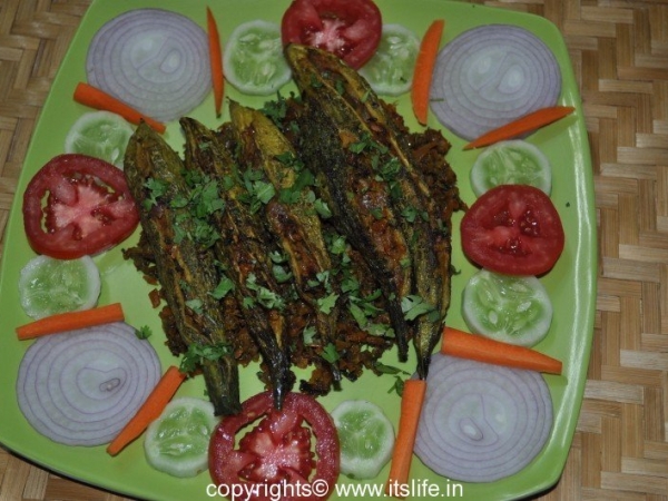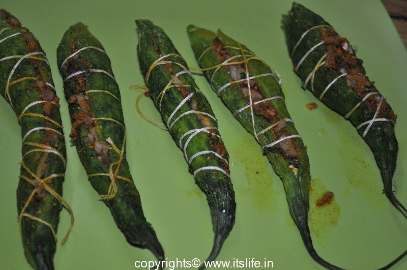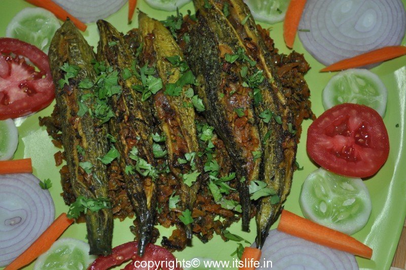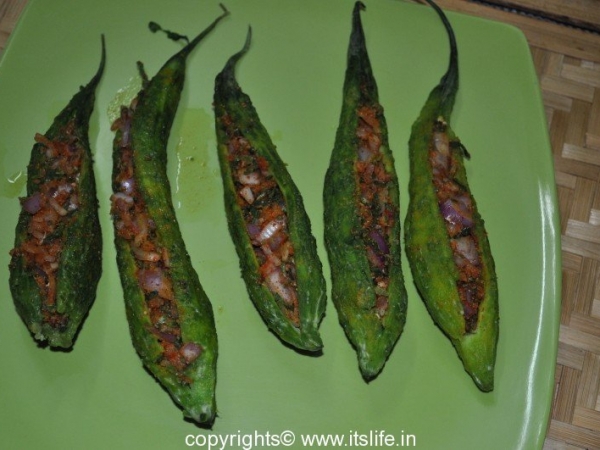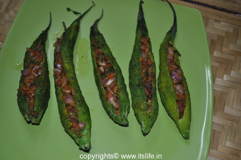 Bitter gourd stuffed with Onions and Masala and shallow fried.