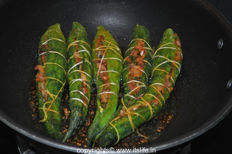 Add the tied and stuffed Karela into the kadai. Shallow fry them turning occasionally without closing the lid until they turn slightly black and crisp.