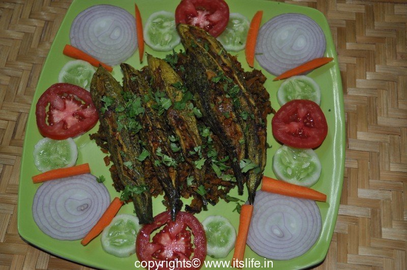 Garnish with Coriander leaves and serve Stuffed Karela with Phulka and Salad.