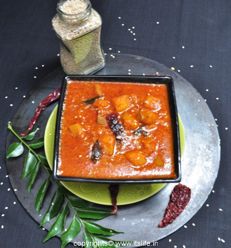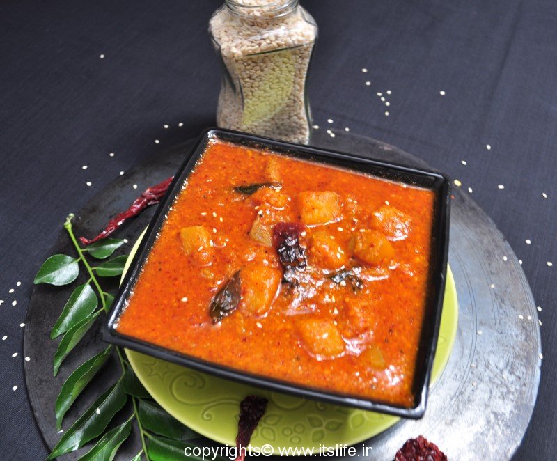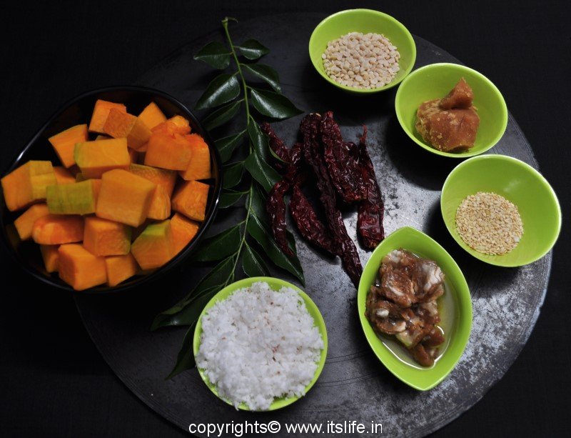 Boil Sweet Pumpkin with very little water. Fry Uddinabele, Red Chilies in Oil. Grind Coconut, Urad Dal, Chilies, Sesame Seeds, Tamarind pulp, Salt and Hing to a paste. Add this to the Sweet Pumpkin and mix well. Add Jaggery and let it boil for a minute. If the dish is too thick, add half cup of water.