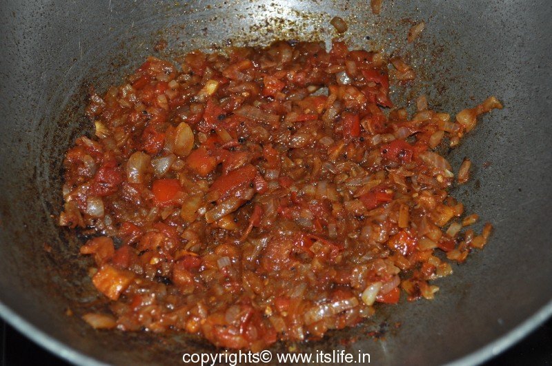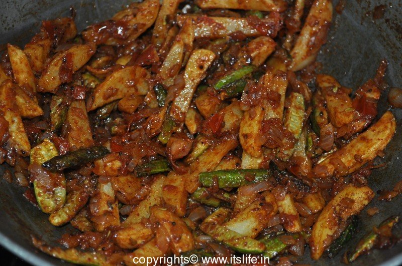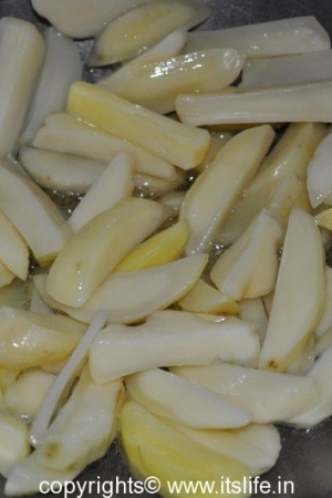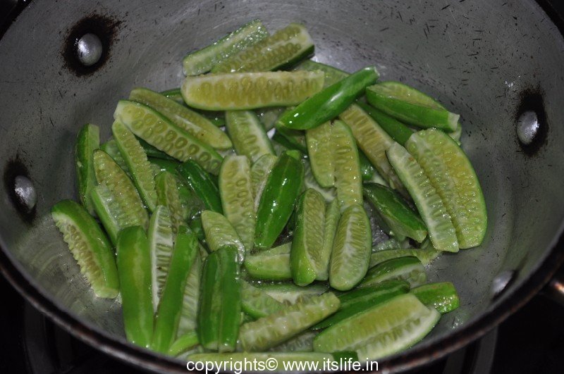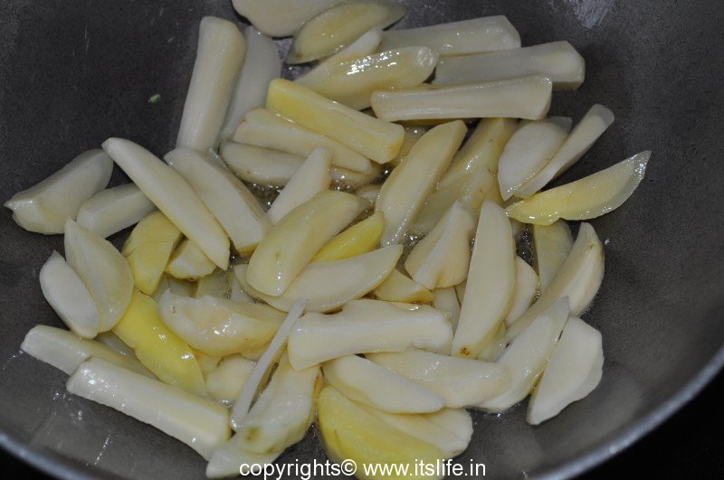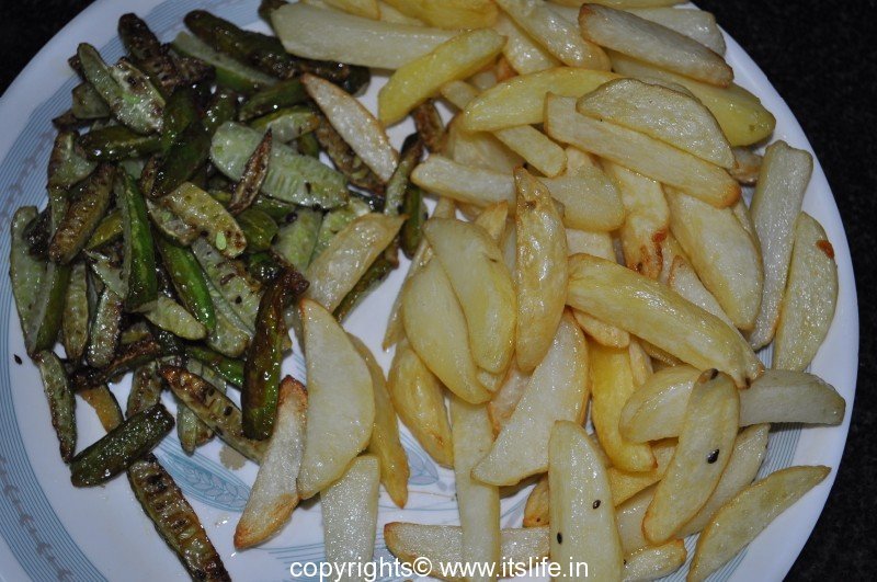 Heat 2 tbsp Oil and fry Tindli for 4 minutes. Heat 3tbsp Oil and fry Aloo until they are soft.