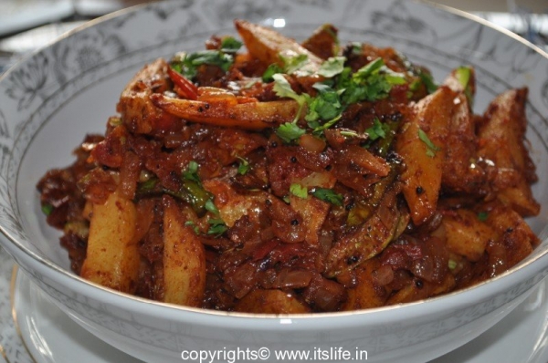 Tindli Aloo Fry is prepared using Ivy Gourd and Potatoes. This dry dish goes well Indian Bread and Raitha.