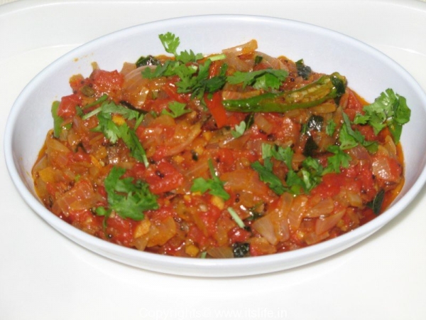 Serve Tomato Onion Masala with your choice of Indian Bread or plain rice.