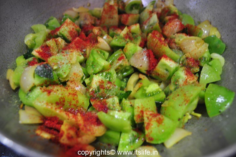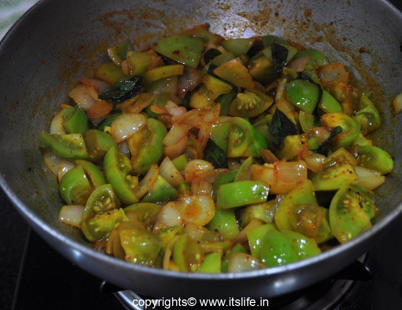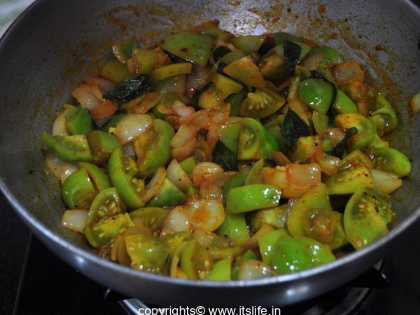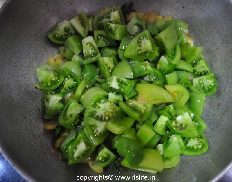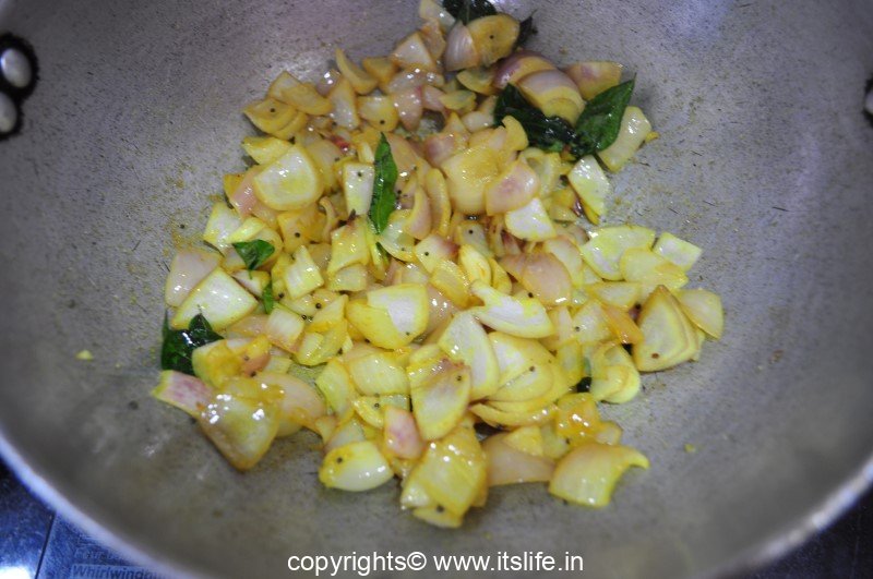 Chop Tomatoes and Onions into big pieces. Heat Oil, add Mustard seeds and when they splutter add Turmeric powder and Curry leaves. Add Onions and stir until they turn translucent.