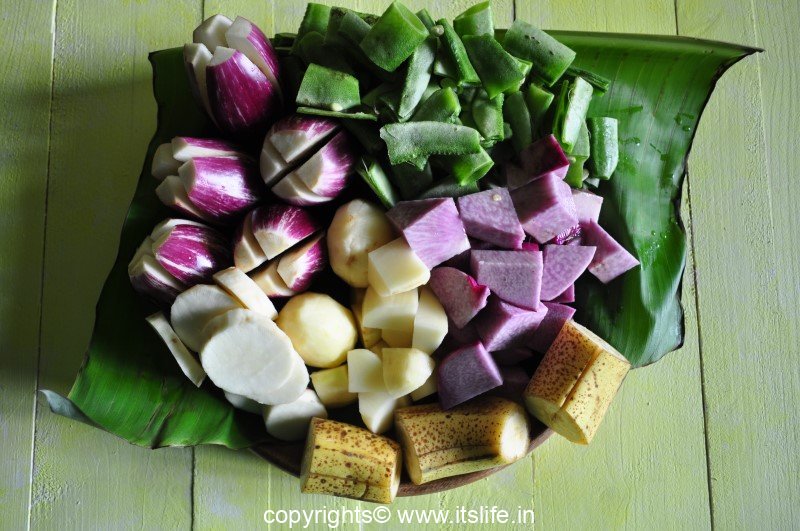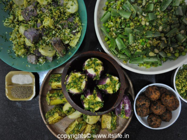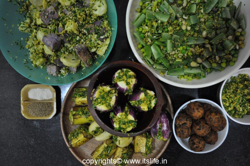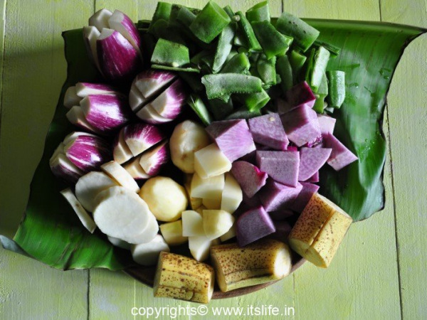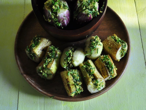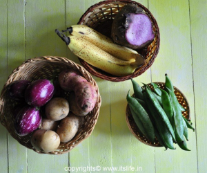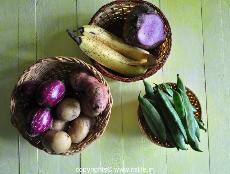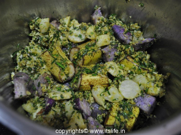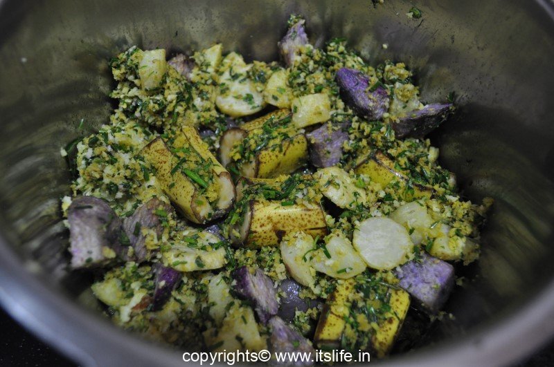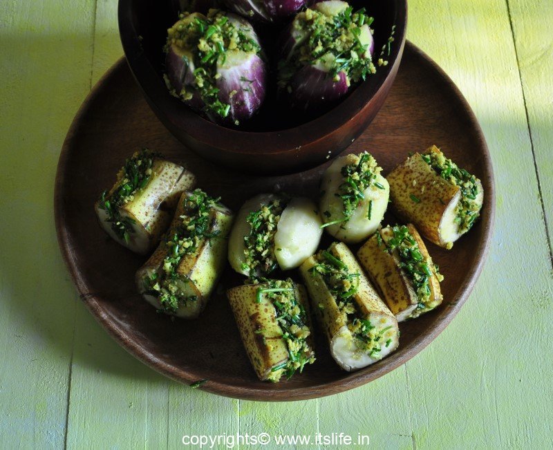 Stuff the above masala into the Brinjals, Potatoes, and Banana and keep it aside.