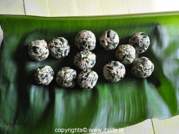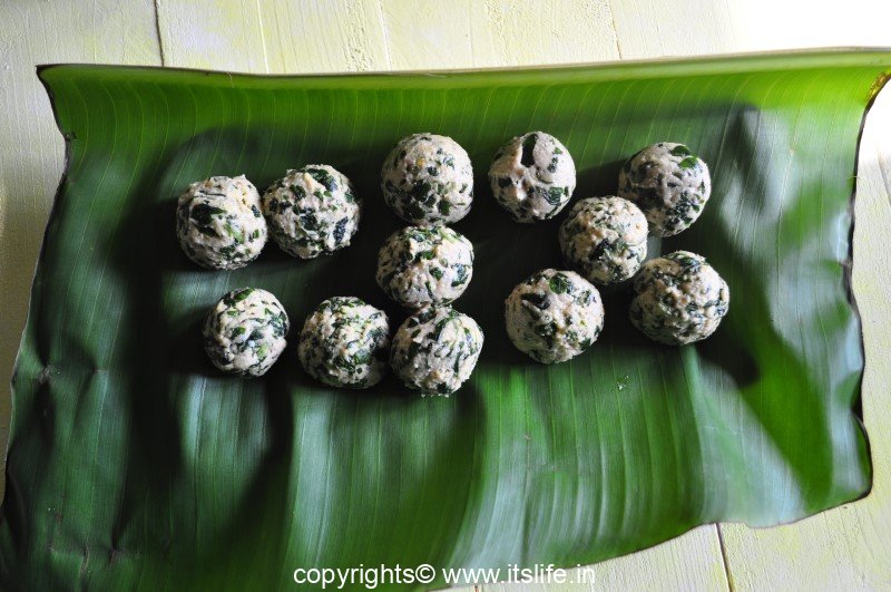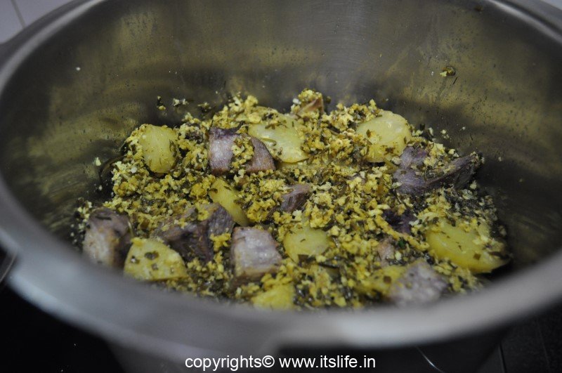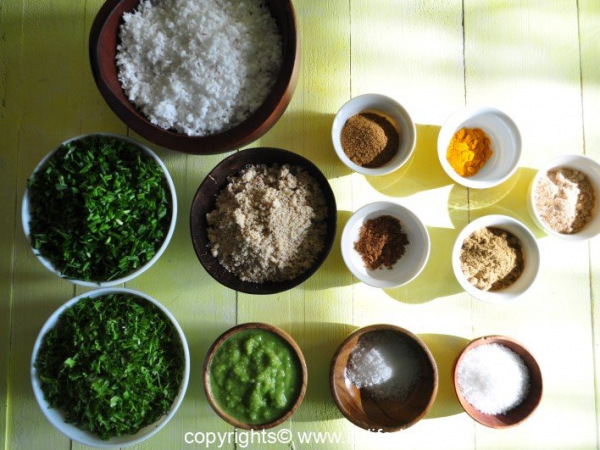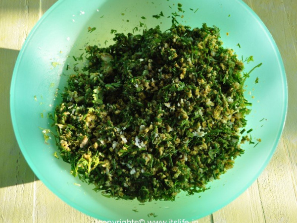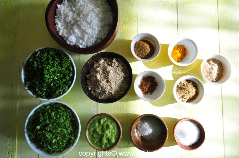 Add Coriander leaves, Garlic Scallions, Coconut, Coriander-Jeera powder, Chili Powder, Ginger-Gralic-Chili paste, Turmeric, Salt, Sugar, Groundnuts, Sesame seeds powder, and 2 tbsp Oil and mix well.