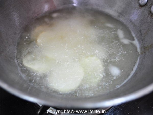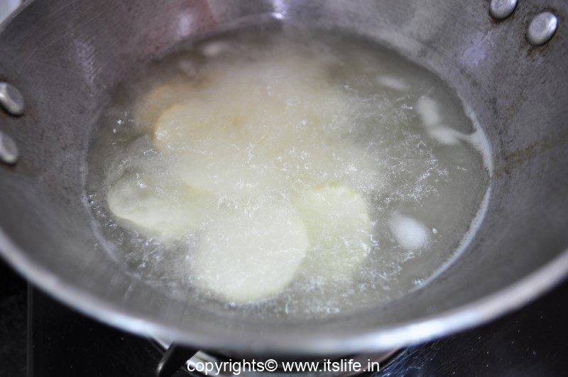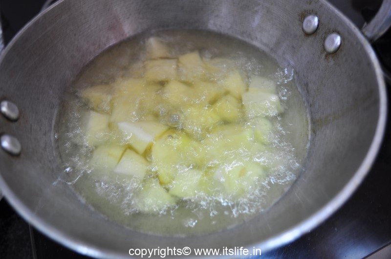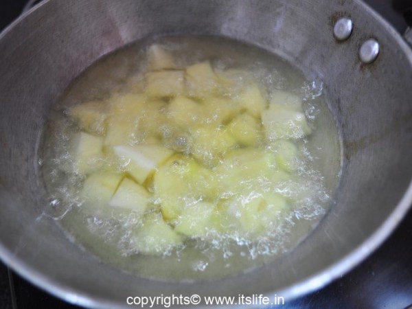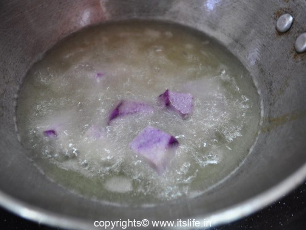 Deep fry the Sweet Potatoes, Diced Potatoes, and Purple Yam.