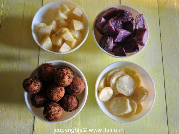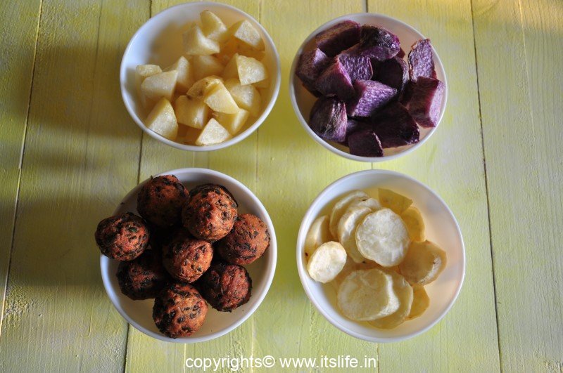 In another mixing bowl, mix another portion of the masala with the deep fried vegetables (Sweet Potatoes, Diced Potatoes, and Purple Yam). Let us call this Mixture2.