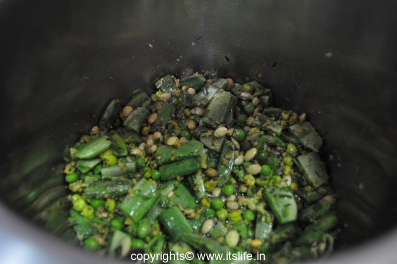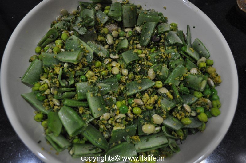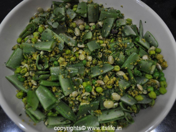 Take a portion of the masala in another mixing bowl and mix the Val Papdi / Chapparada Avarekayi, Val Dana / Avarekayi, Green Tuvar / Togari Kalu or Shelled Peas with the masala and keep it aside. Let us call this Mixture1.