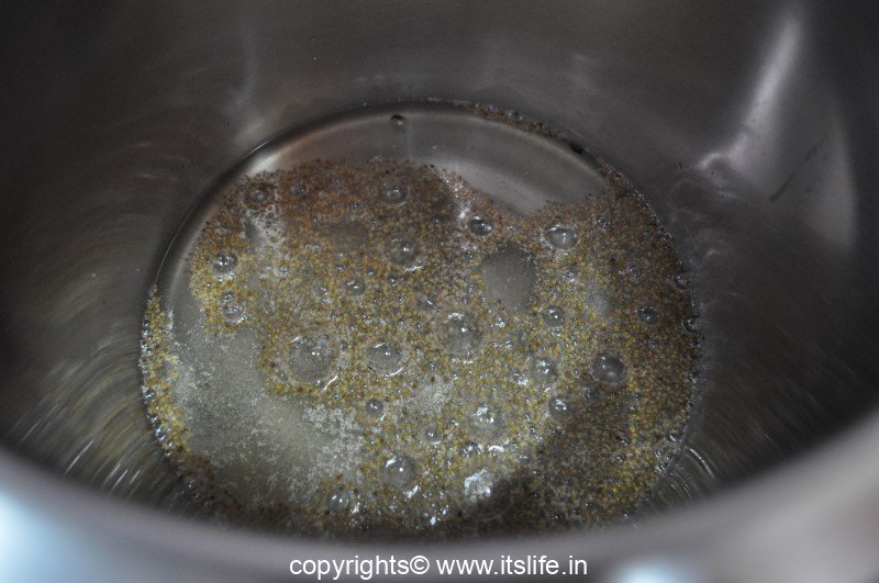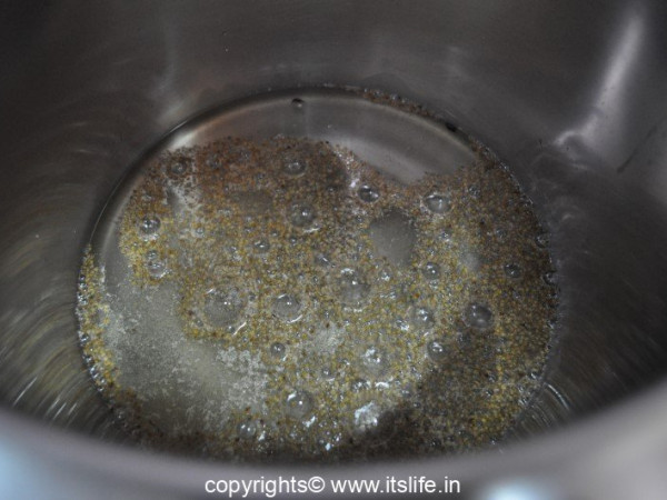 Heat Oil in a thick-bottomed vessel or a cooker. Add Carom seeds and Asafoetida.