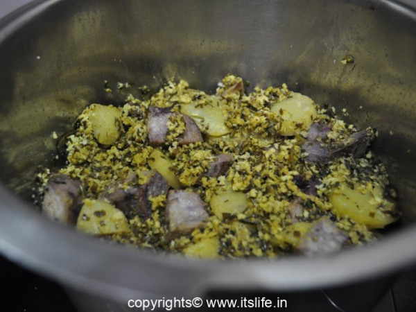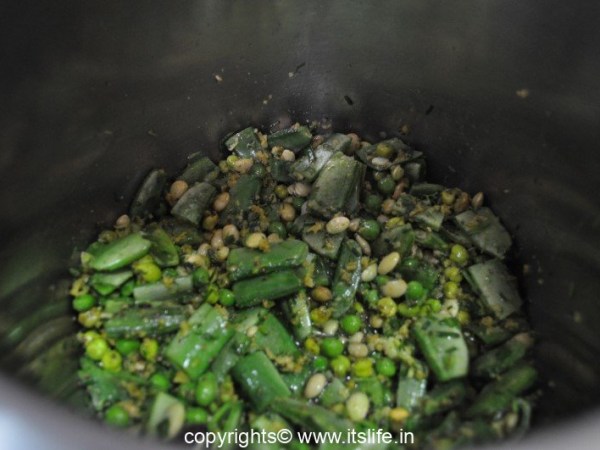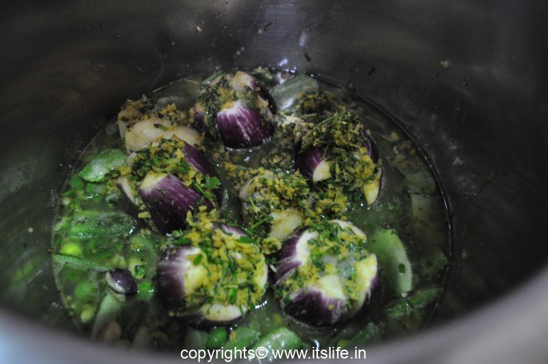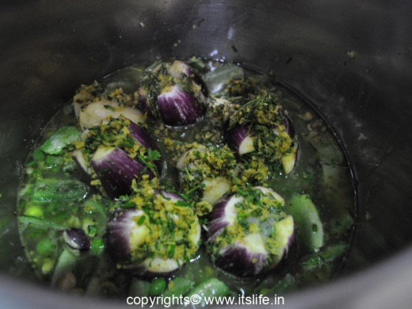 Spread Mixture2 over the stuffed vegetables. Add 2 Cups of water and close the vessel and cook for 3 to 4 minutes.