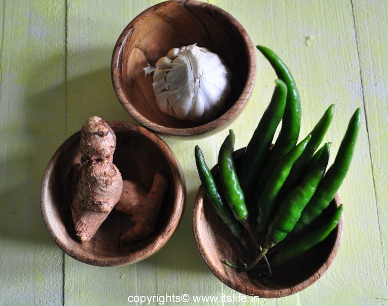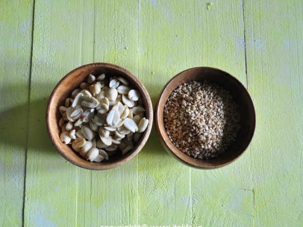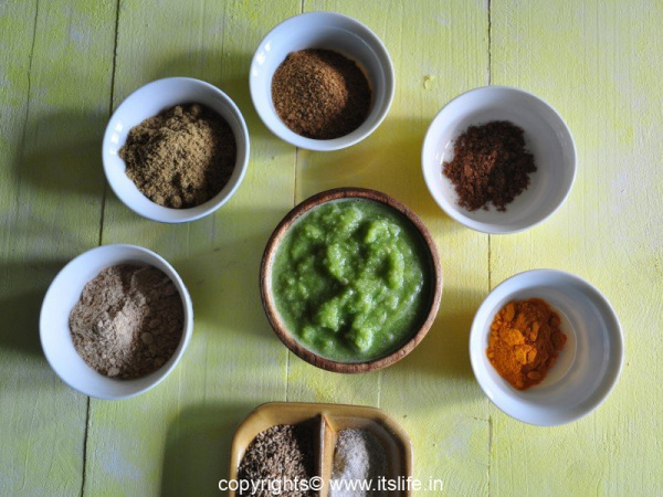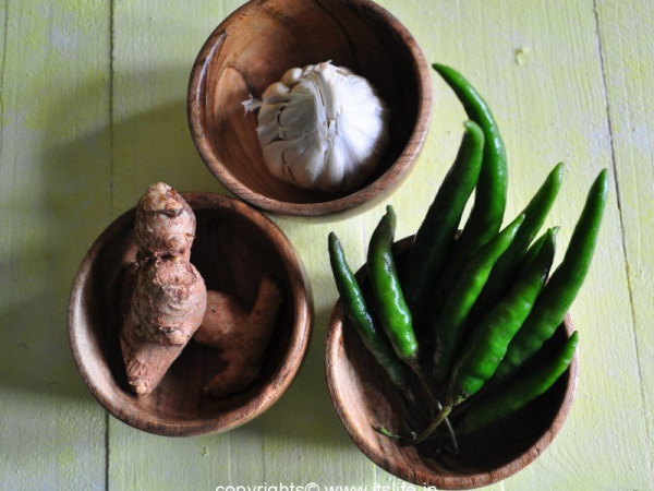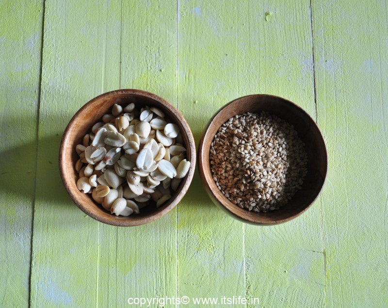 Grind Groundnuts and Sesame seeds to a powder. Grind Ginger, Garlic, and Green Chilies to a paste.