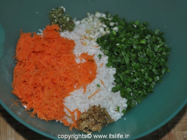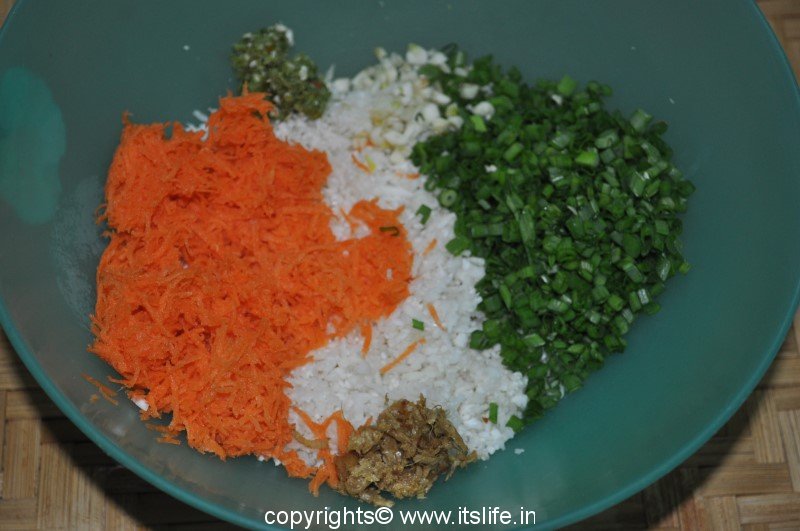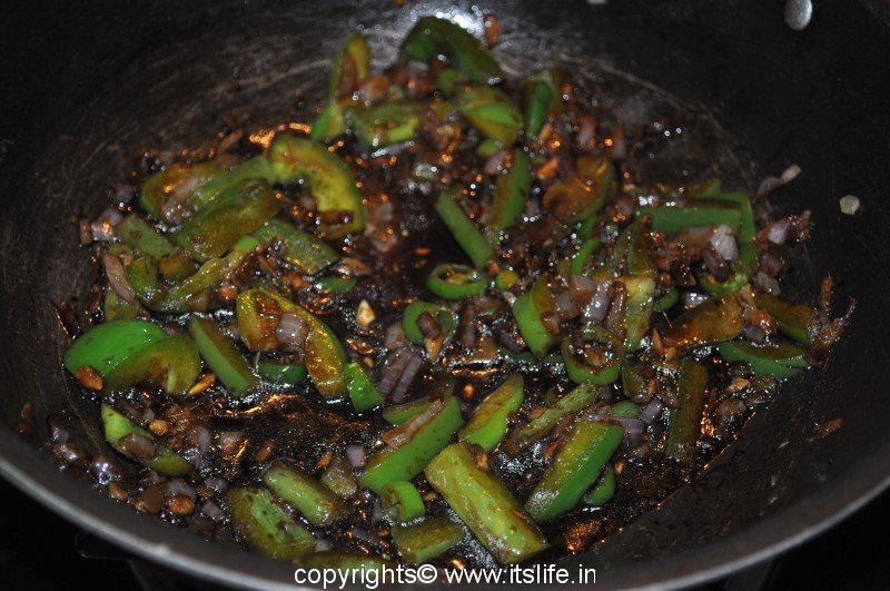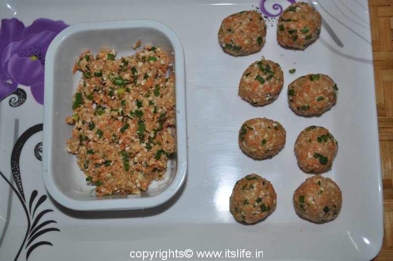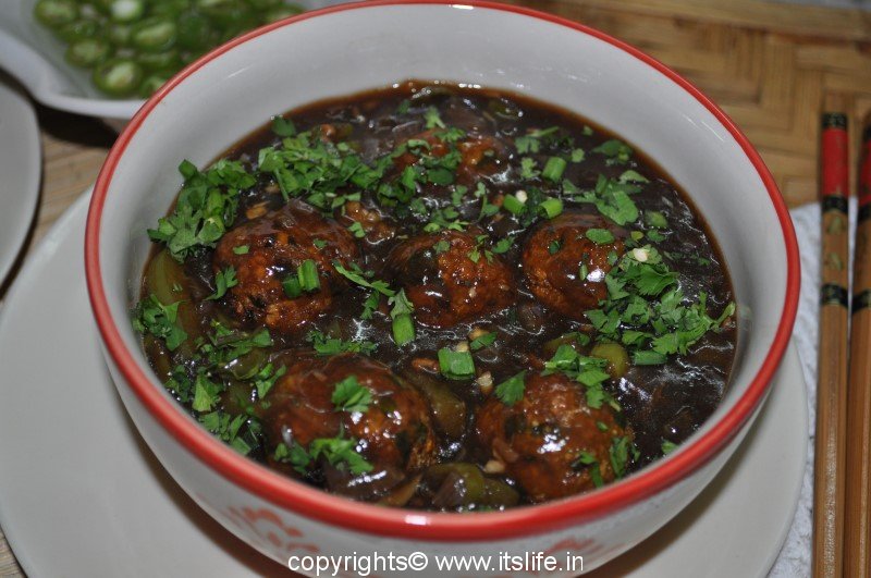 Dilute corn flour in 3 tbsp water and add. Cook until the sauce is little thick. Now, add the deep fried vegetable balls to the gravy and serve with fried rice or noodles.