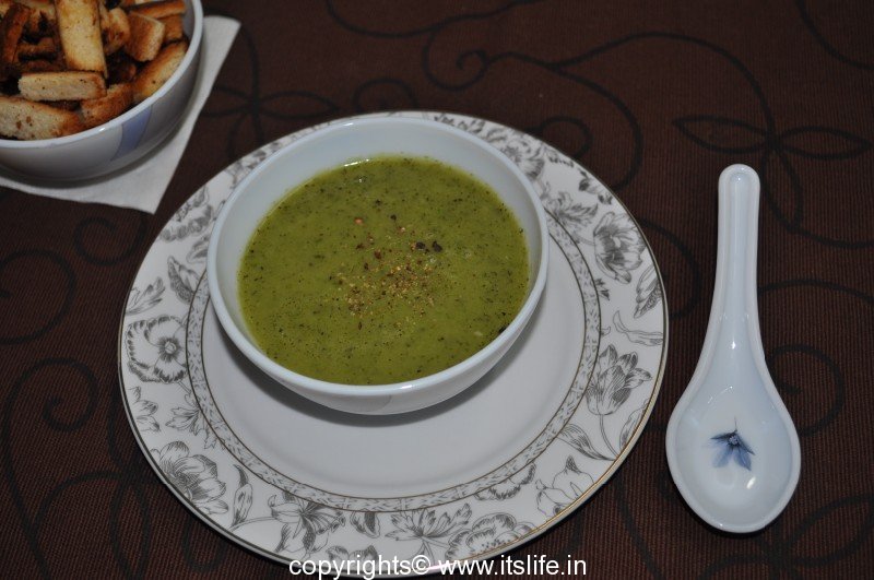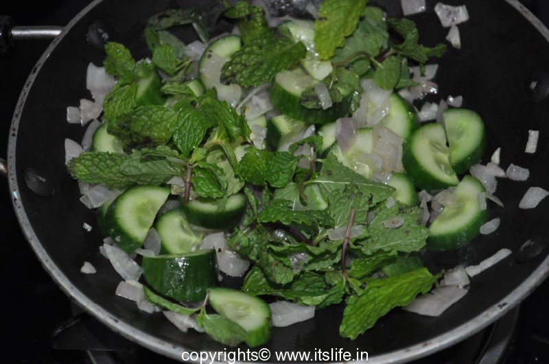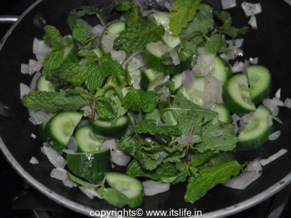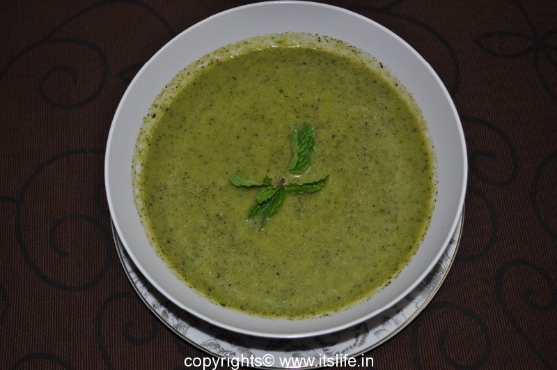 Serve chilled Hot Cucumber and Mint Soup garnished with mint leaves.