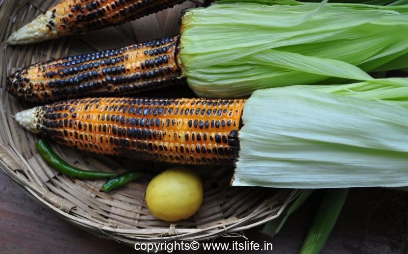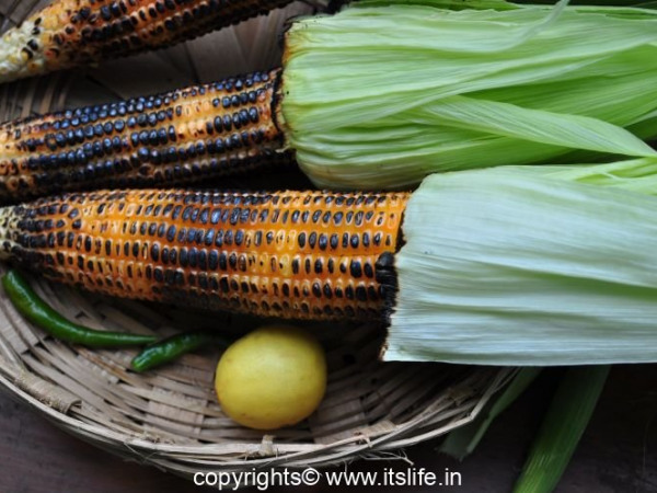 As people welcome rain, carts loaded with Corn are seen at the street corner roasting them and selling them to eager customers. Corn roasted on coal and served smeared with Mint Chutney or Salt, Chili powder and Lemon juice.