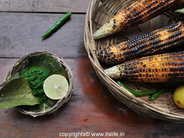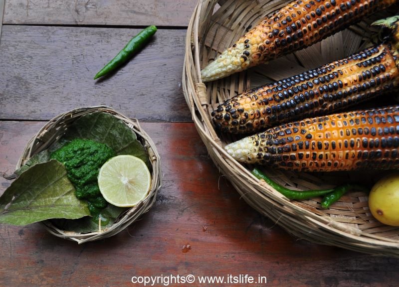 Remove to the Bhutta– Roasted Corn on a tray and smear with Mint Chutney using the Lemon slice or smear the mixture of Salt and Chili Powder and serve.