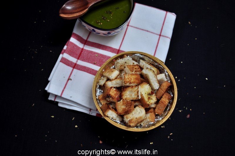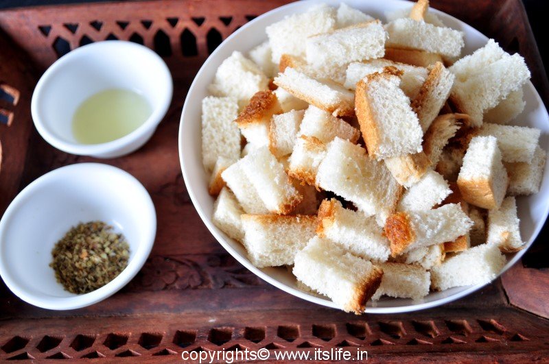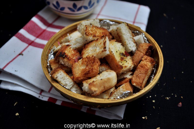 Crispy Croutons are bread croutons toasted with herbs. This aromatic croutons goes well when served with soup.
