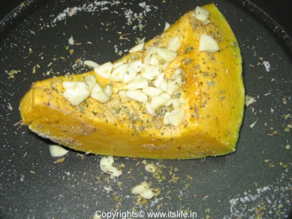 Add Salt, Pepper, 2 pods chopped Garlic and Thyme on the Pumpkin piece and roast it in the oven until soft.