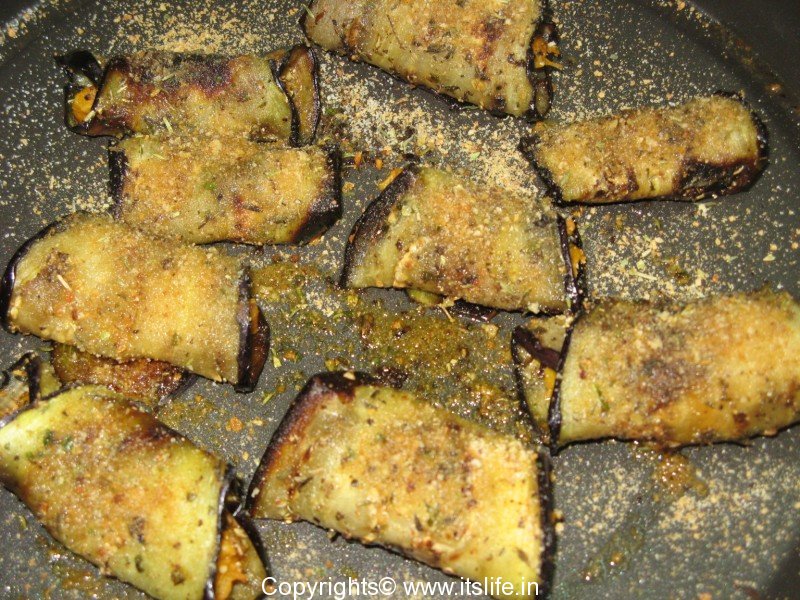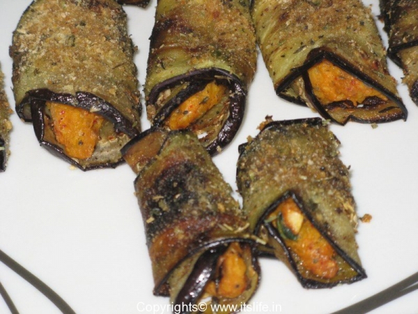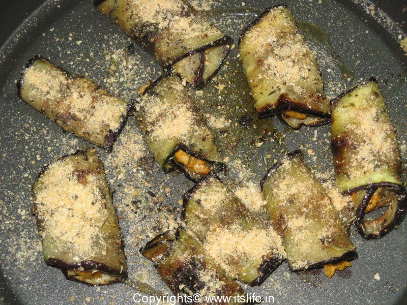Spray Olive oil on a baking dish, and some herbs. Arrange the Eggplant rolls on the baking dish. Sprinkle Bread Crumbs and add Olive Oil on the Eggplant rolls.