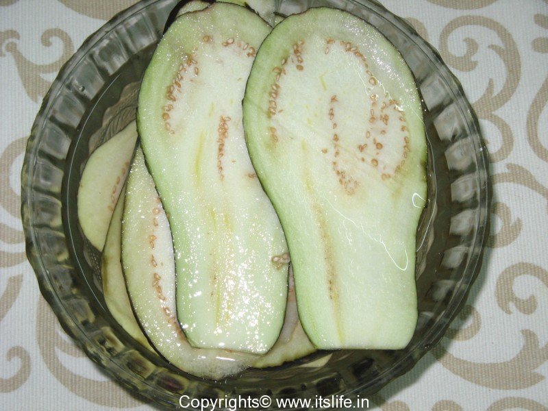 Slice the Eggplant lengthwise. Immerse the pieces in salt water for 10 minutes.