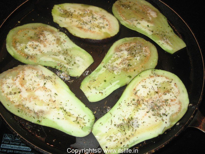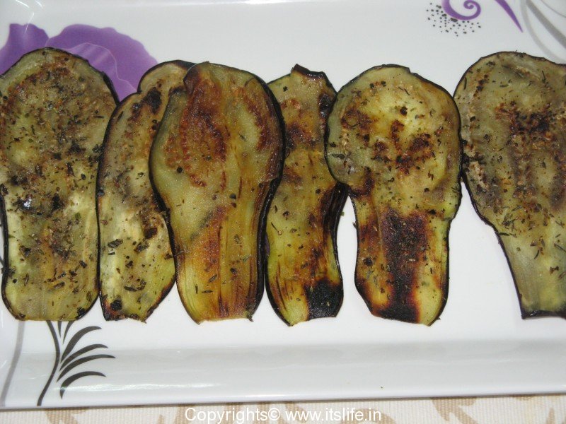 Remove the pieces and pat dry them on a kitchen towel. Season the slices with Salt, Black Pepper, Marjoram, and spray Olive oil over them. Grill the Eggplant slices.